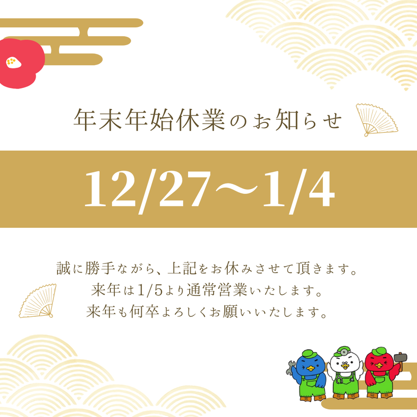 2025年12月18日NEW お知らせ 年末年始休業のお知らせ 平素は格別のご高配を賜り、誠にありがとうございます。 誠に勝手ながら、下記の期間を年末年始休業とさせていただきます。 休業期間 2025年12月27日(土) ~ 2026年1月4日(日) 休業期間中にいただきましたお問い合わせにつきましては 2026年1月5日(月)より順次対応させていただきます。 お客様にはご不便をおかけいたしますが、 何卒ご理解賜りますようお願い申し上げます。